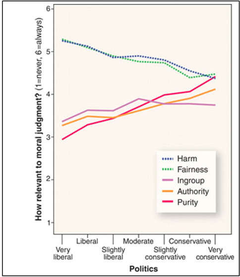 Haidt and his colleagues, in their paper "Liberals and Conservatives Rely on Different Sets of Moral Foundations," graphed five "moralities" -- (a) harm/care (strong empathy for those that are suffering and care for the most vulnerable); (b) fairness/reciprocity (life liberty and justice for all); (c) ingroup/loyalty (tribalism, patriotism, nationalism); (d) authority/respect (mechanisms for managing social rank, tempered by the obligation of superiors to protect and provide for subordinates); and (e) purity/sanctity (related to the evolution of disgust, that makes us see carnality as degrading and renunciation as noble) -- to show how liberals give priority to only to the first two, harm/care and fairness/reciprocity, while conservatives give roughly equal weight to all five. 25