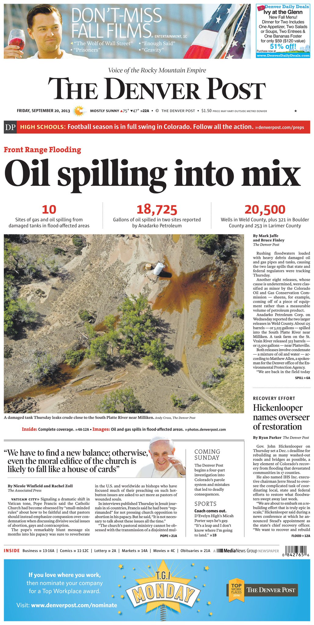 Environment Colorado: “The largest spill occurred on Wednesday when about 5,225 gallons of crude oil flowed into the South Platte River near Milliken. Nearly 2 million residents of Denver rely on the South Platte for their drinking water…” (9/23/2013)