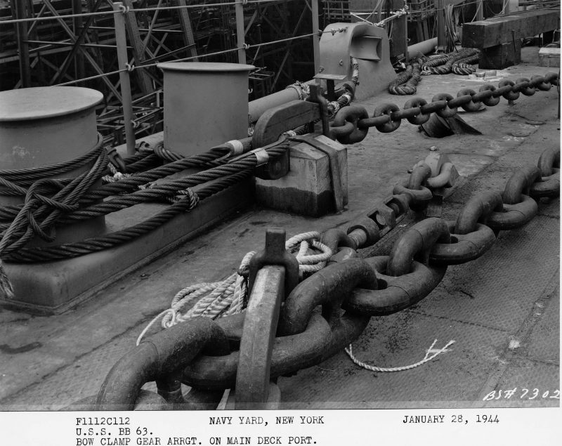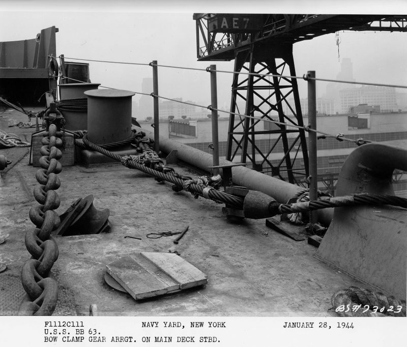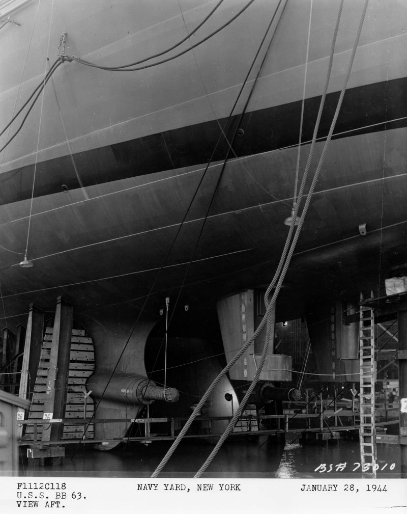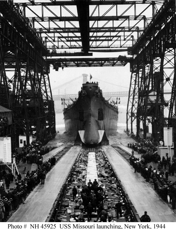 battery (quad 40mm) is being installed and the teak deck is being laid.After end, outside cradle, 27 January 1944.Looking forward from the Missouri’s (BB-63) propellerless stern, 27 January 1944.Bow clamp gear arrangement on main deck starboard, 28 January 1944.View aft, 28 January 1944.MK 37 gun director being loaded aboard the Missouri (BB-63).Bow clamp gear arrangement on main deck port, 28 January 1944. Early in the day of Missouri’s (BB-63) launch at the New York Navy Yard on 29 January 1944.Things are looking up before Missouri’s (BB-63) launching.Approaching the end of the building ways as she is launched, 29 January 1944, at the New York Navy Yard.Entering