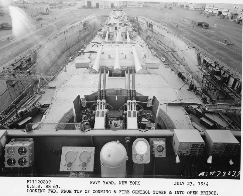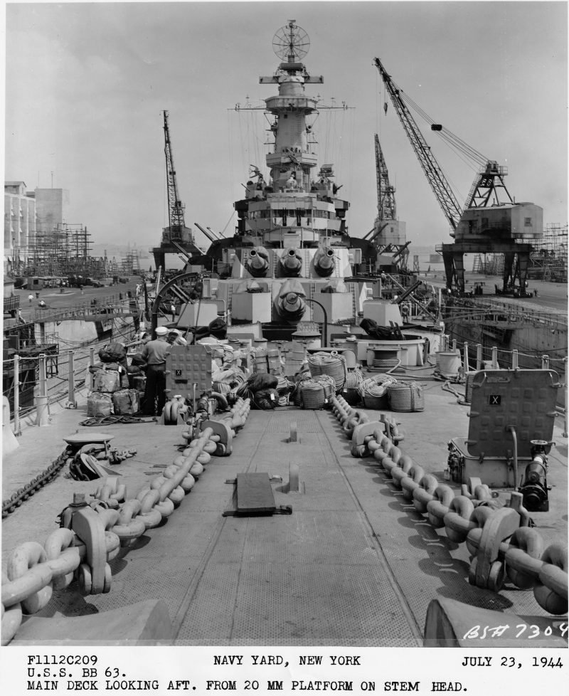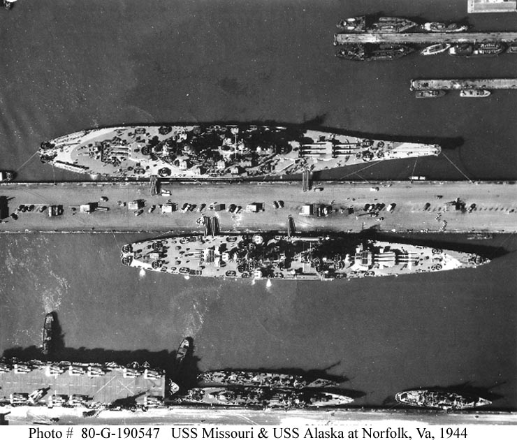 July – December 1944 Stern view looking forward from dry dock caissonPort side of upper bow looking inboard from side of dry dockLooking forward from bottom of dry dock at sternStarboard side looking forward from bottom of dry dockBow view looking aft from inboard end of dry dockMain deck looking forward from anchor windlass control stationMain deck looking aft from 20mm platform on stem headUSS Missouri & USS Alaska at Norfolk, Virginia 1944Looking forward from top of conning and fire control tower and into open bridgeStarboard side looking aft from bottom of dry dock